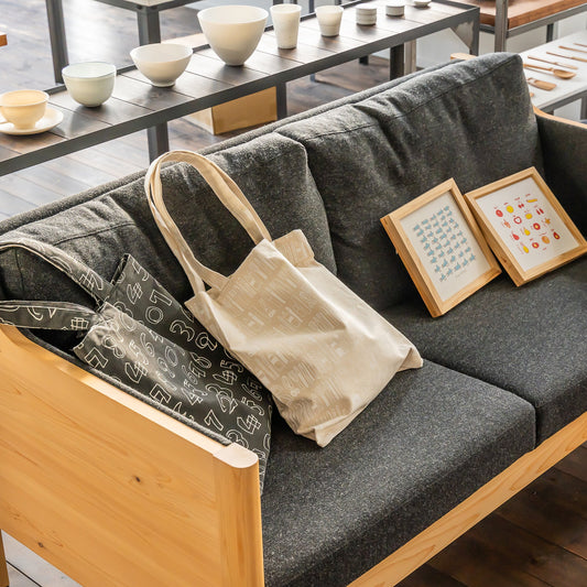 ちょっとしたお出かけにぴったりな想造楽工のバッグたち。トートバッグは、「あえてのペラペラ」が人気の薄手コットン素材を使用。使うほどにくたっとやさしく馴染んでいきます。サコッシュは、厚手のコットン生地で、しわが入りにくいしっかりめの生地なので旅行カバンにしのばせておくのもオススメです。