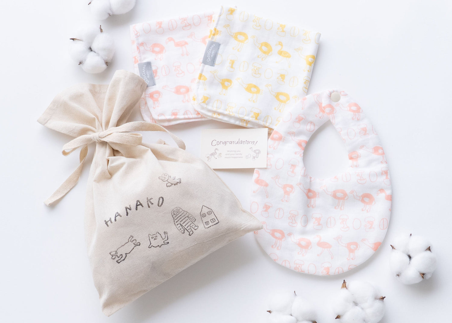 【ギフトセット】手作りスタイとガーゼハンカチのセット(カード・名入れ巾着付)