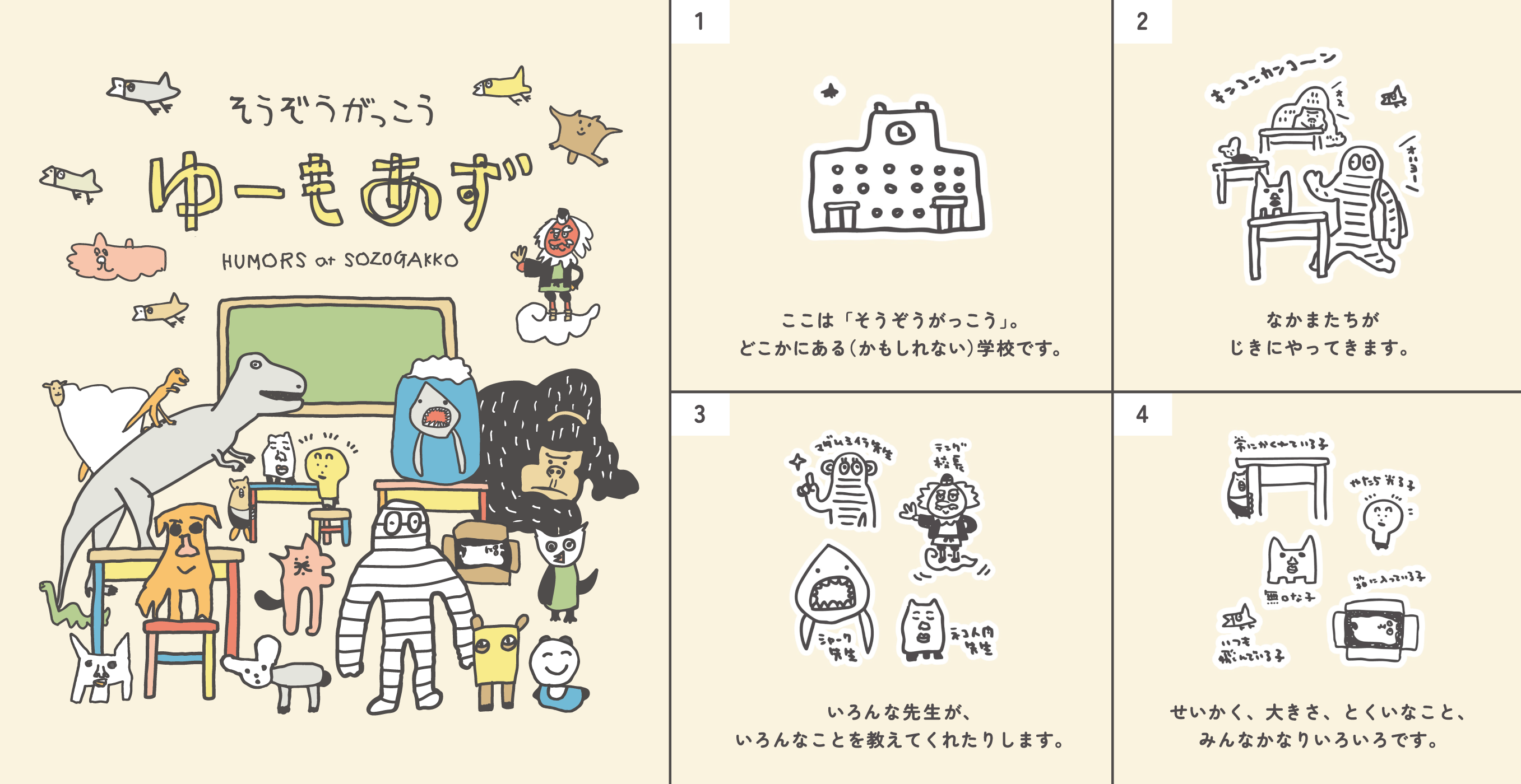 これまで誕生したさまざまなキャラクターたちの物語。舞台は、どこかにあるかもしれない『そうぞうがっこう』という「学校」。