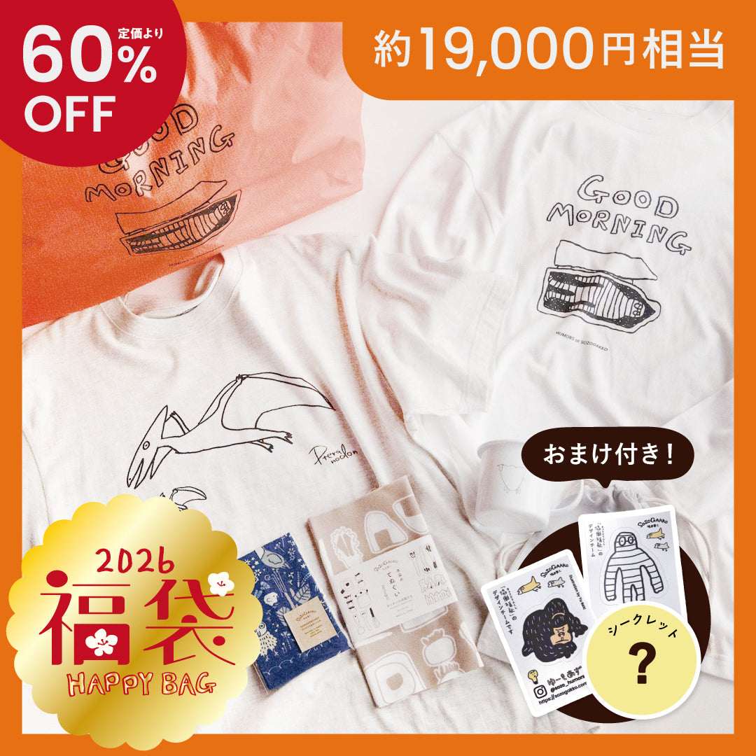 さらにさらにオマケで、「ゆーもあず」のステッカーと合計3,000円分のシークレット商品2つをお付けして、合計9点とバッグのお得なセットとなります。