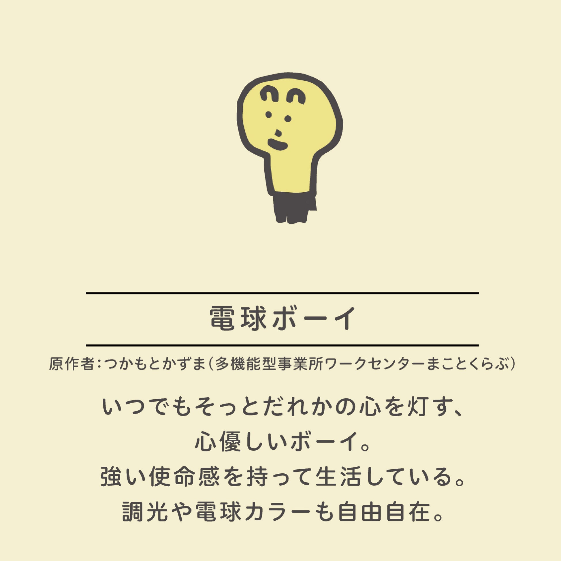 ほんわかと光る電球ボーイ。にっこり微笑む表情に癒されます。