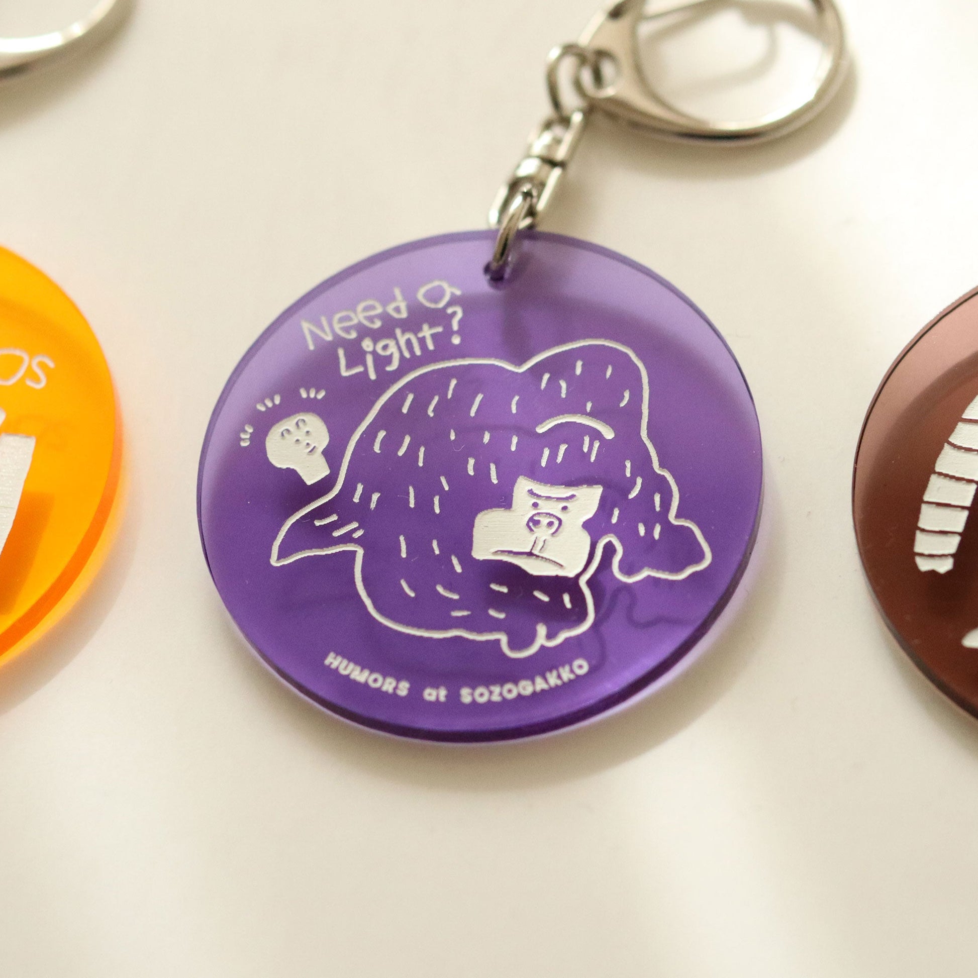 パープルのアクリルキーホルダーに、ふたりのキャラクターが仲良くプリントされています。電球ボーイの側には「Need a Light?」の文字が印字されており、見るたびにほっこりした気持ちにさせてくれます。