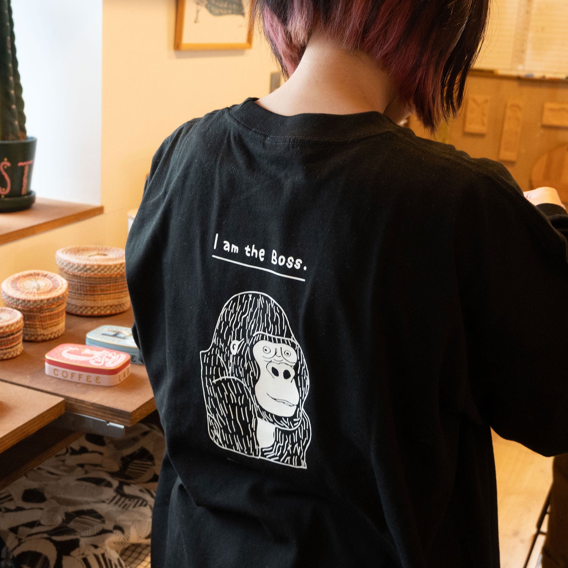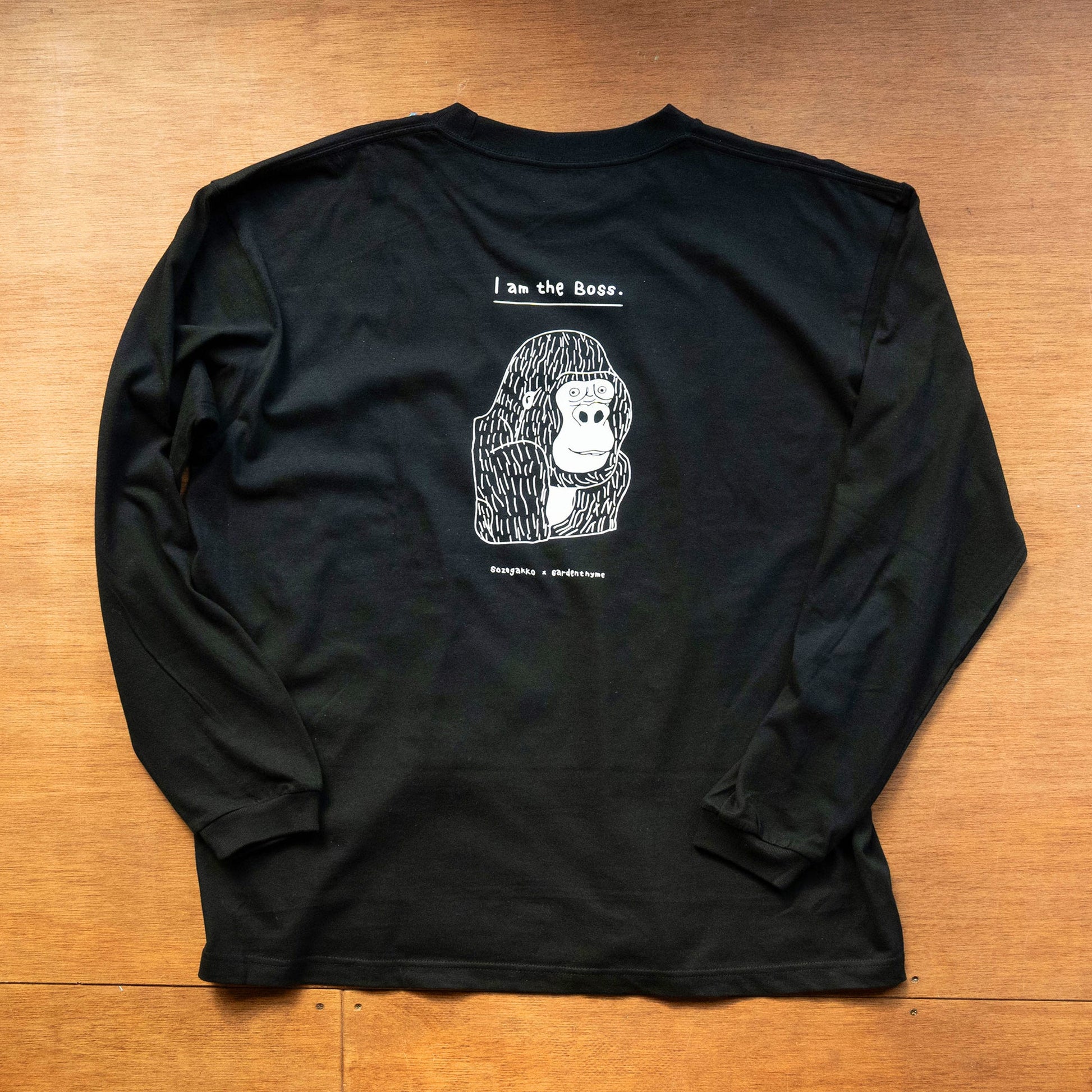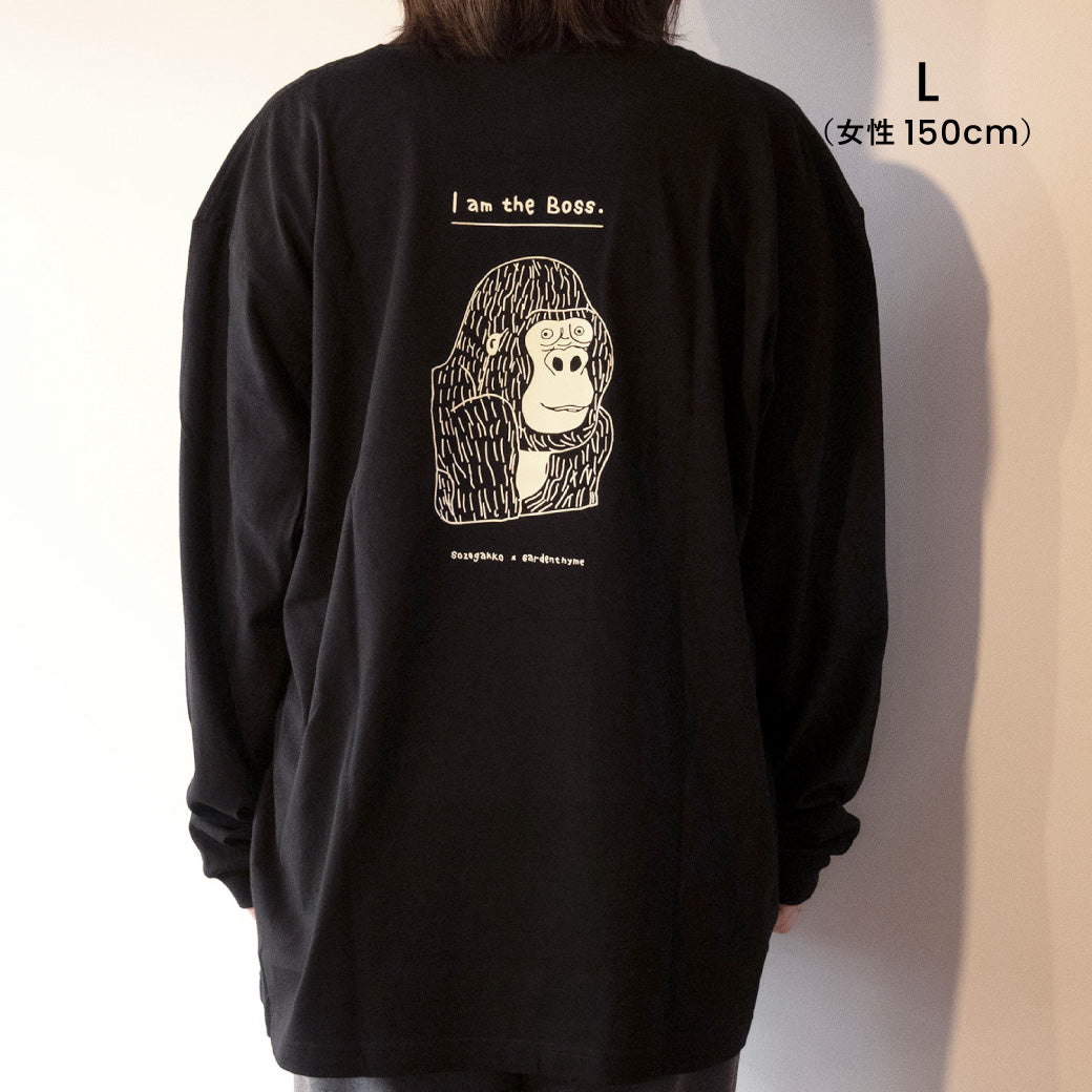 街でもジャングルでも視線を独り占めしちゃうユーモアあふれる「ゴリラ親分」のイラストが背中にプリントされたロンTです。