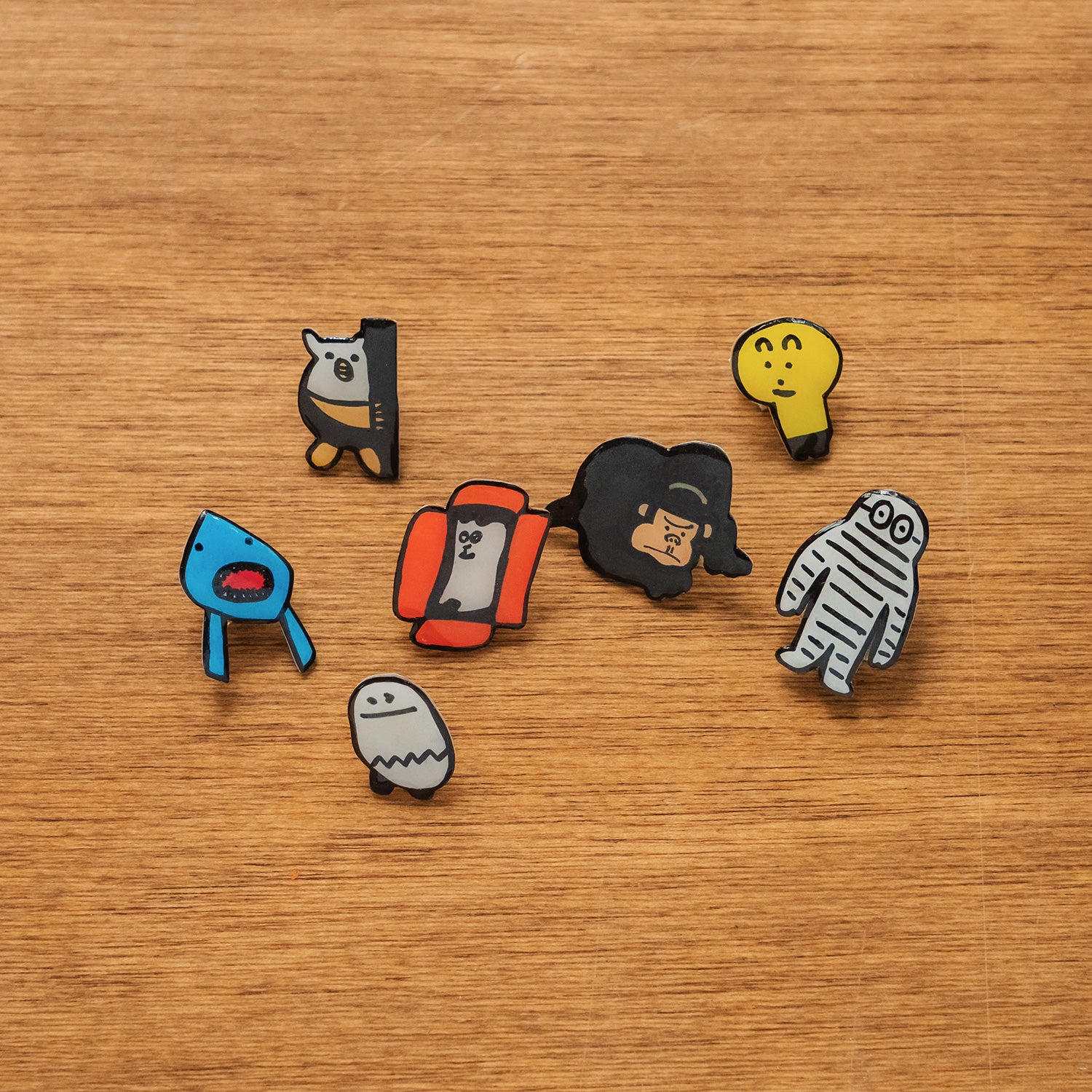 看板商品のピンバッジは、東京都八王子市を拠点に活動されているアクセサリー作家のhundredさんとのコラボ作品です。